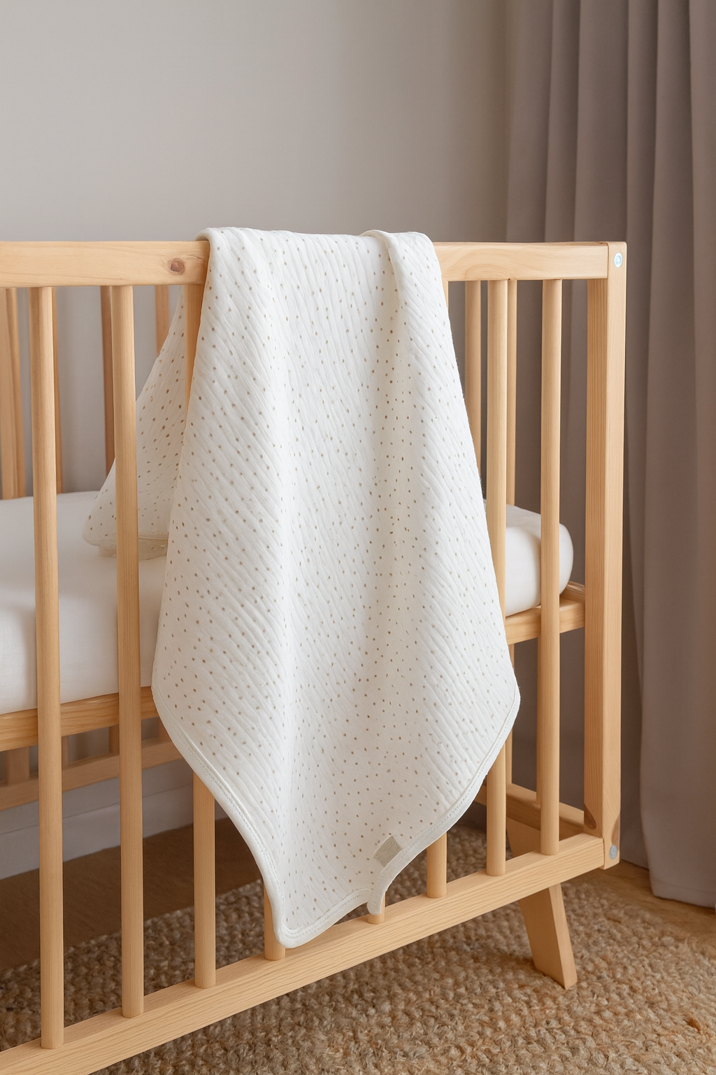 Tek parça olarak tasarlanan bu battaniye, standart ölçüleri (80×80 cm) ile bebeğiniz için maksimum koruma sağlayacak şekilde dizayn edilmiştir. Çift taraflı kullanım özelliği, esneklik ve fonksiyonelliği artırarak hem anne hem de bebek için gündelik hayatı kolaylaştırır. Düz ve sade deseniyle hem şık bir görünüm sergiler hem de her türlü oda dekorasyonuna uyum sağlar. Ayrıca yerli üretim olan ürün, dayanıklılığı ve kalite standartlarına uygunluğu ile uzun süreli kullanım imkanı tanır.